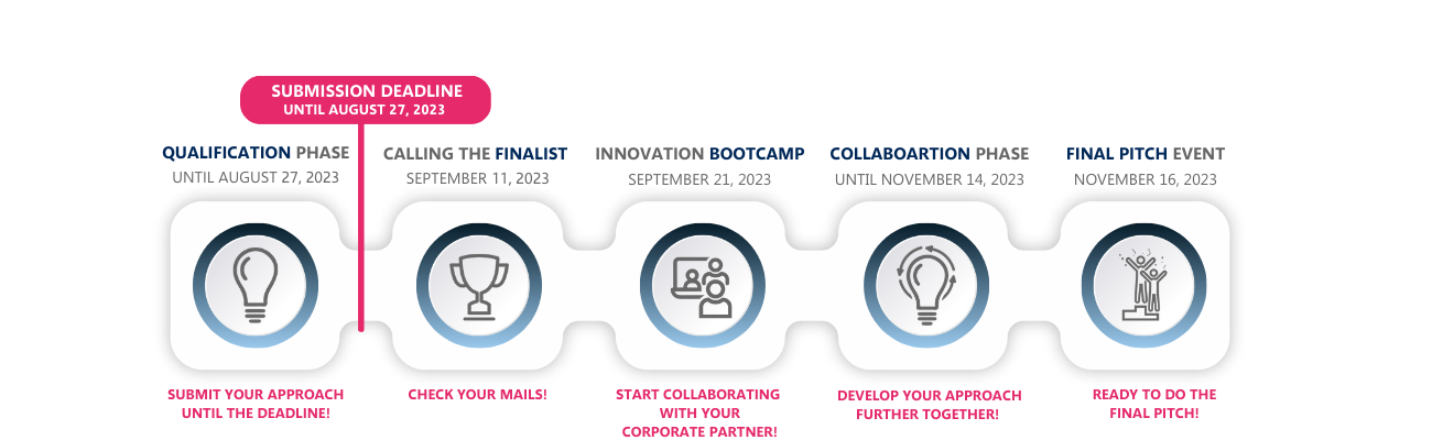 Over the following phase the goal is to further advance your approaches in close communication with your challenge provider. The concrete form of the collaboration can vary per challenge and is adapted to the needs of the challenge provider, finalists and the solution.