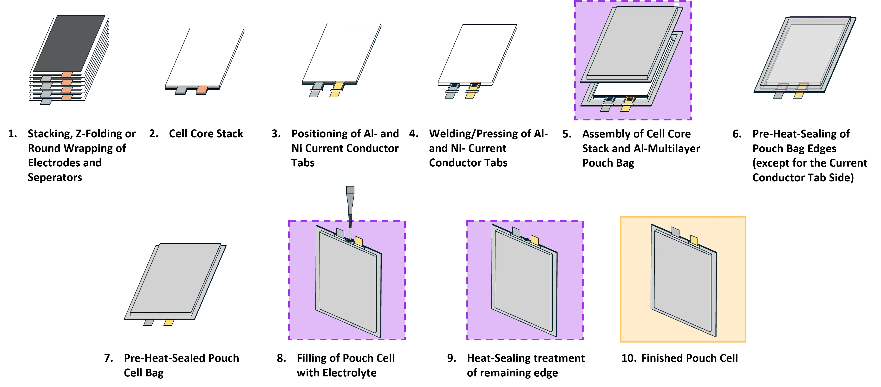 This section outlines the current assembly steps used in Na-Ion pouch cell production, providing an overview of the key stages such as electrode preparation, sealing, and electrolyte filling. If participants propose alternative sealing techniques, the assembly process may differ, but understanding the current baseline is crucial for informed innovation.