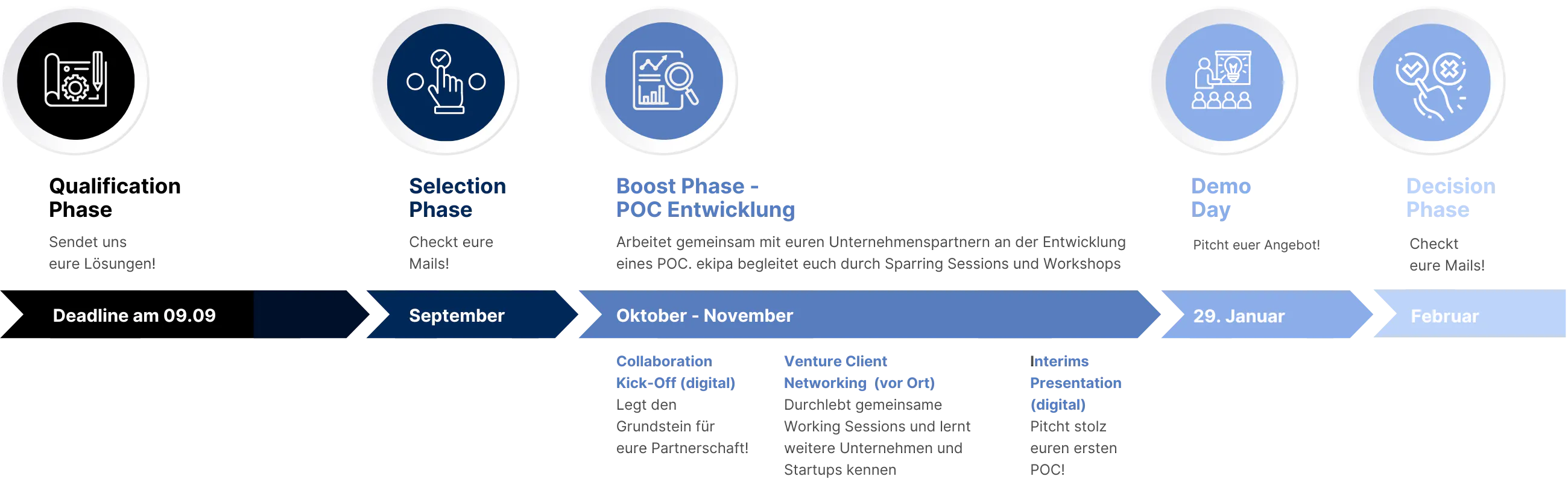 Nach dem Demo Day folgt eine Entscheidungsphase, die etwa zwei Wochen dauert. In dieser Phase prüft die EAM die konkreten Angebote für eine langfristige Zusammenarbeit und entscheidet anschließend über den Einstieg in eine konkrete Kooperation. An diesem Punkt unterstützt ekipa beide Seiten im Entscheidungsprozess.