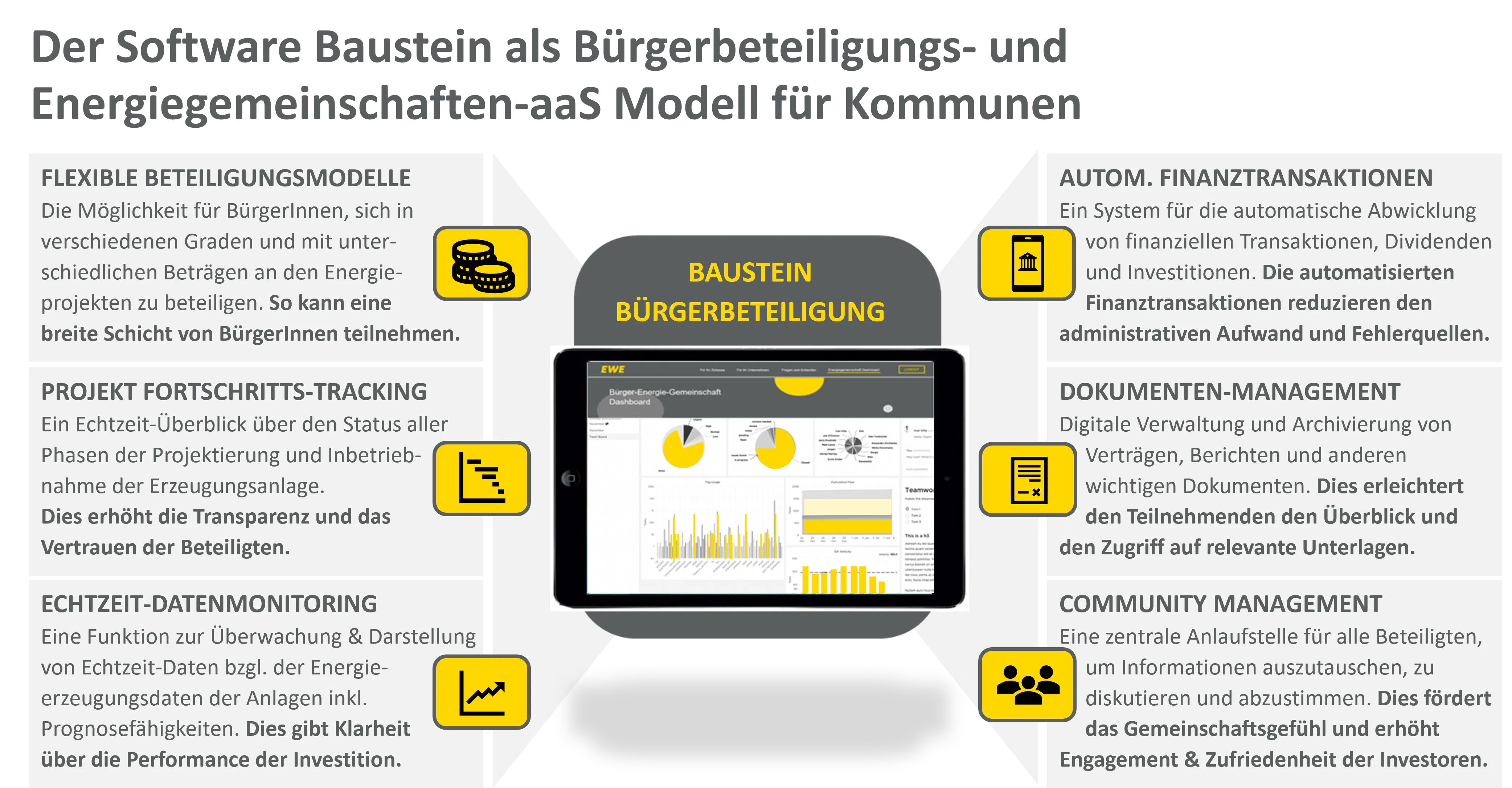 - Sicherstellung von Transparenz und Vertrauen durch Echtzeit-Daten und Fortschritts-Tracking über den gesamten Prozess von der Interessensbekundung über die Projektierung bis zur Inbetriebnahme und Renditeausschüttung